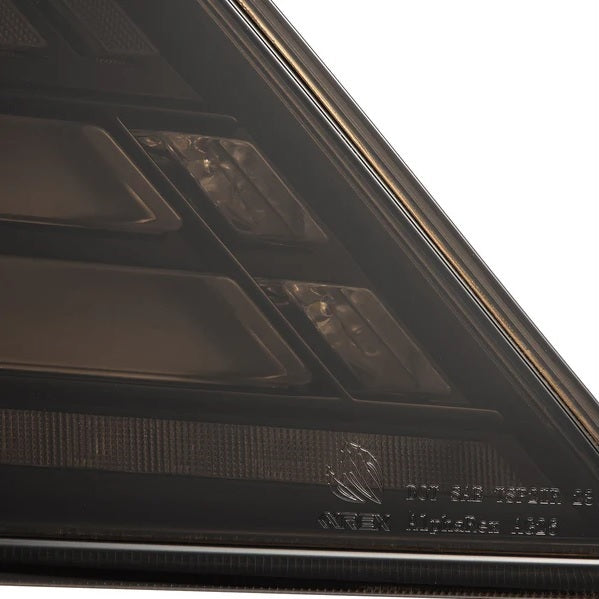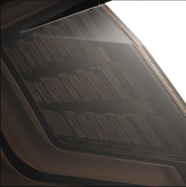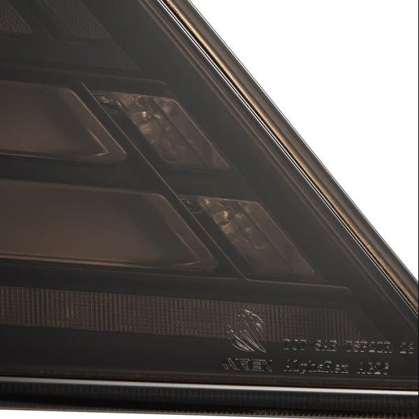 These tail lights feature dual LED tubes serving as red parking lights, with trapezoidal prisms in the center for a modern 3D effect during the day, which also function as red brake lights. At the end of each dual LED tube, two prisms provide white LED reverse lights, ensuring optimal visibility in low-light conditions. Additionally, a clear LED bar at the bottom offers the flexibility to function as either a sequential or blinking amber turn signal.